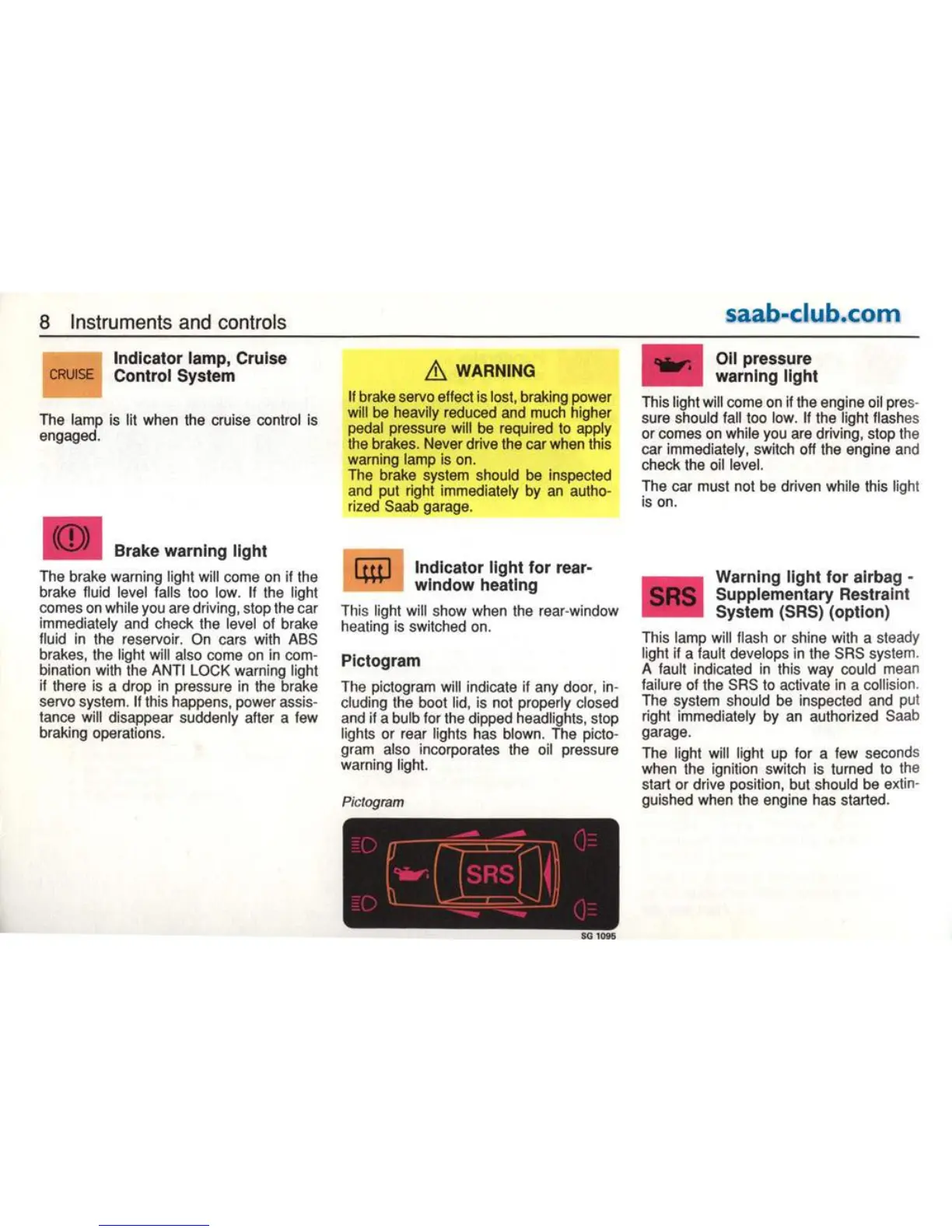 Saab 9000 1995 - Indicator Lights and Systems; Cruise Control and Brake Warning Lights; Heating and Airbag Warning Lights