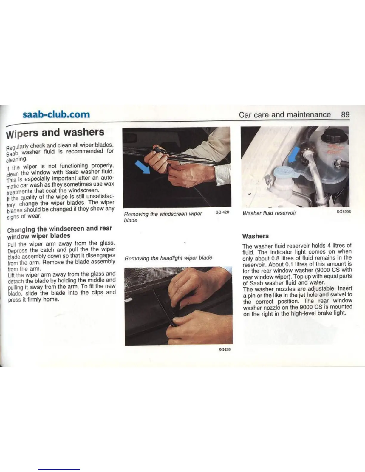 Saab 9000 1995 - Wiper and Washer Maintenance; Wiper Blade Replacement Guide; Washer Fluid Reservoir Check