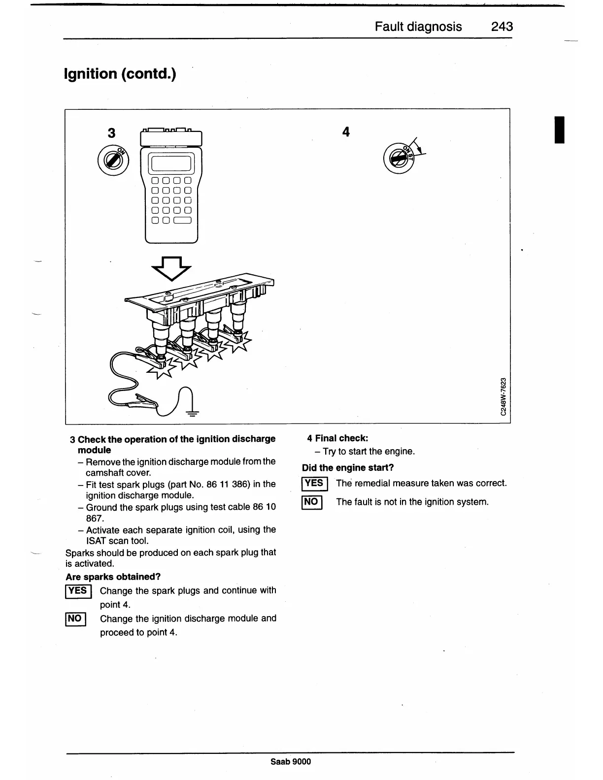 - Ground the spark plugs using test cable 86 10