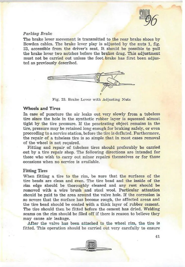 Saab 96 - Parking Brake; Wheels and Tires; Fitting Tires