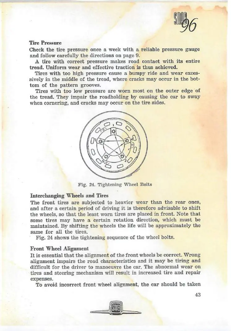 Saab 96 - Tire Pressure; Interchanging Wheels and Tires; Front Wheel Alignment