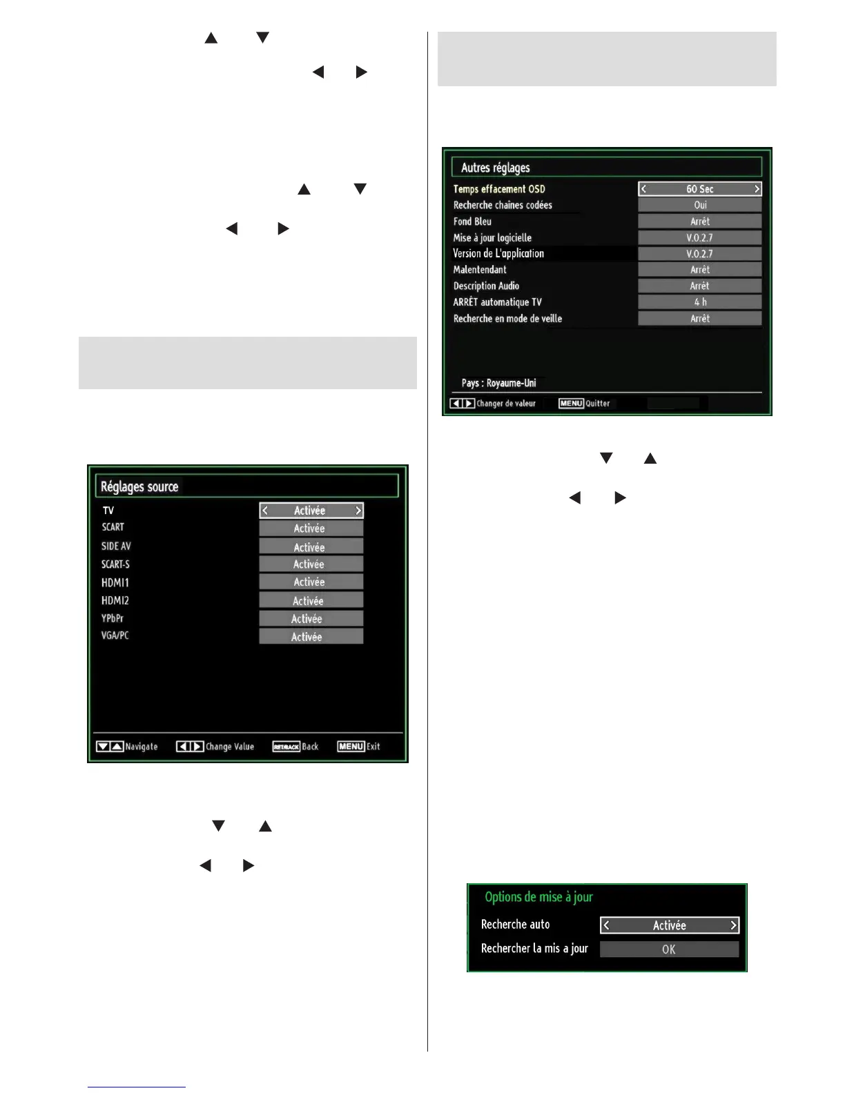 Sélectionnez Sources dans le menu Réglages et •
