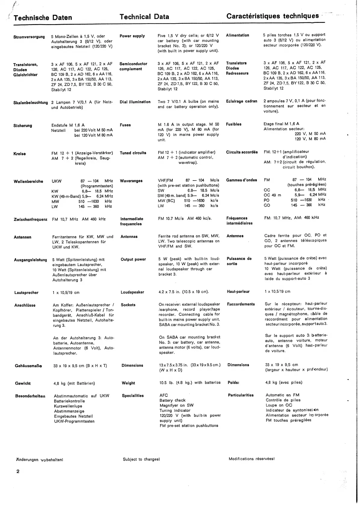 Saba Transall de Luxe automatic - Technical Data; Electrical Specifications; Physical and Feature Specifications