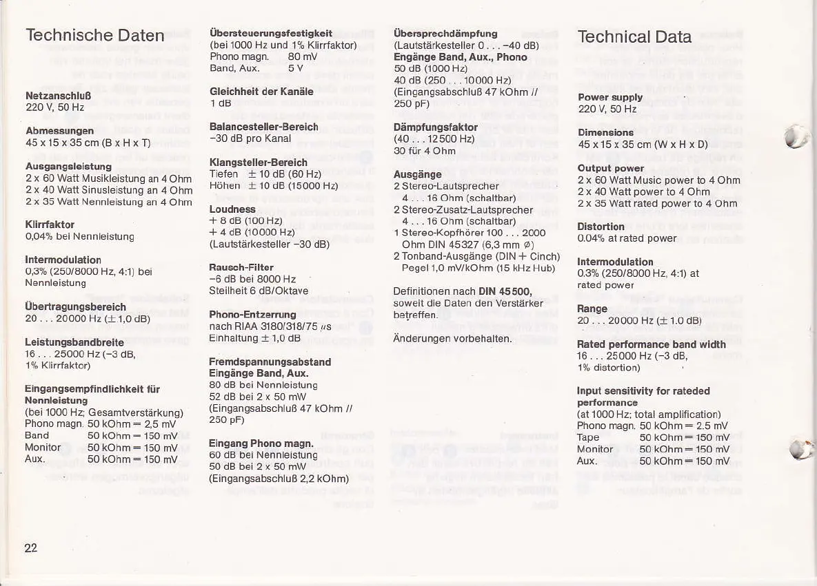 Saba VS 2080 - Technical Specifications; Power Supply, Dimensions, and Output Power; Performance Metrics: Distortion, Intermodulation, and Frequency; Input Sensitivity and Signal-to-Noise Ratios