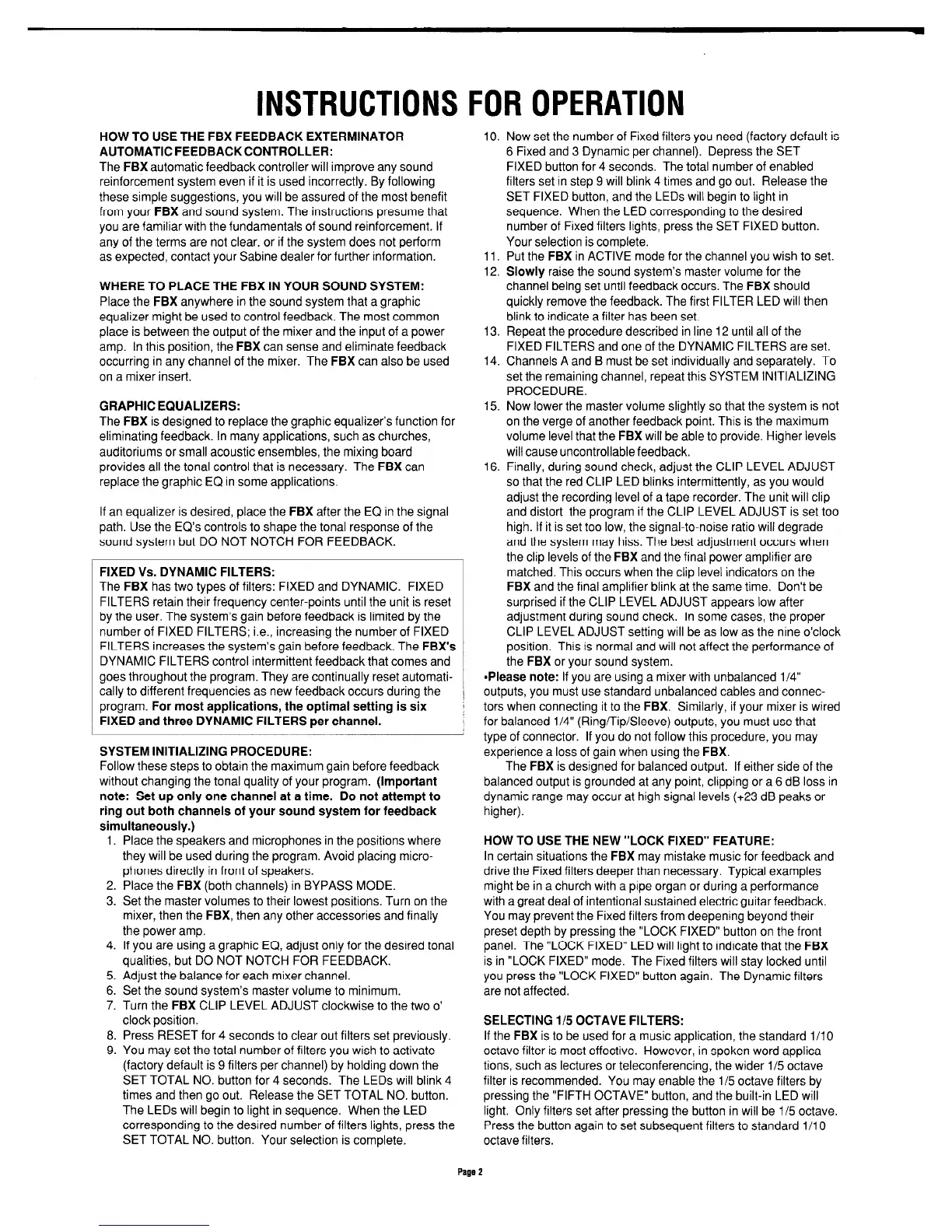 SABINE FBX-1802 - Instructions for Operation; Automatic Feedback Controller Setup; System Placement and Configuration; System Initializing Procedure