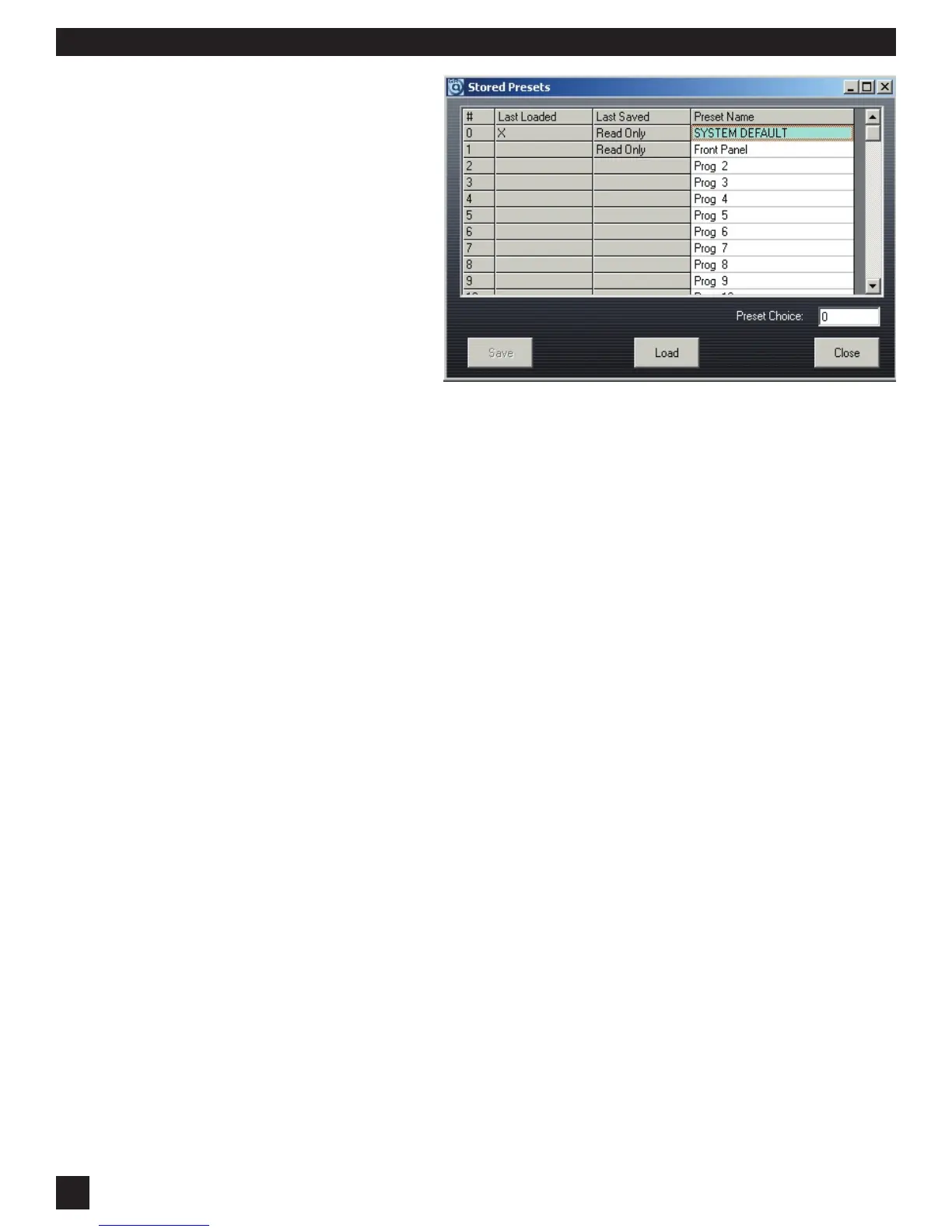 When loading or saving configurations, the Stored Presets screen will stay open until you close it. This