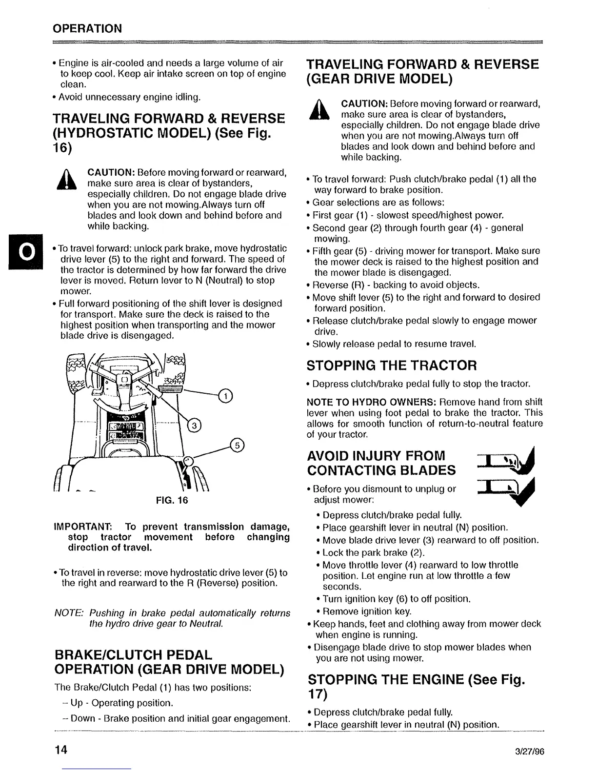 Sabre 1646 Hydro - Tractor Driving Procedures (Hydrostatic and Gear); Tractor Operation Details; Stopping Procedures and Blade Safety