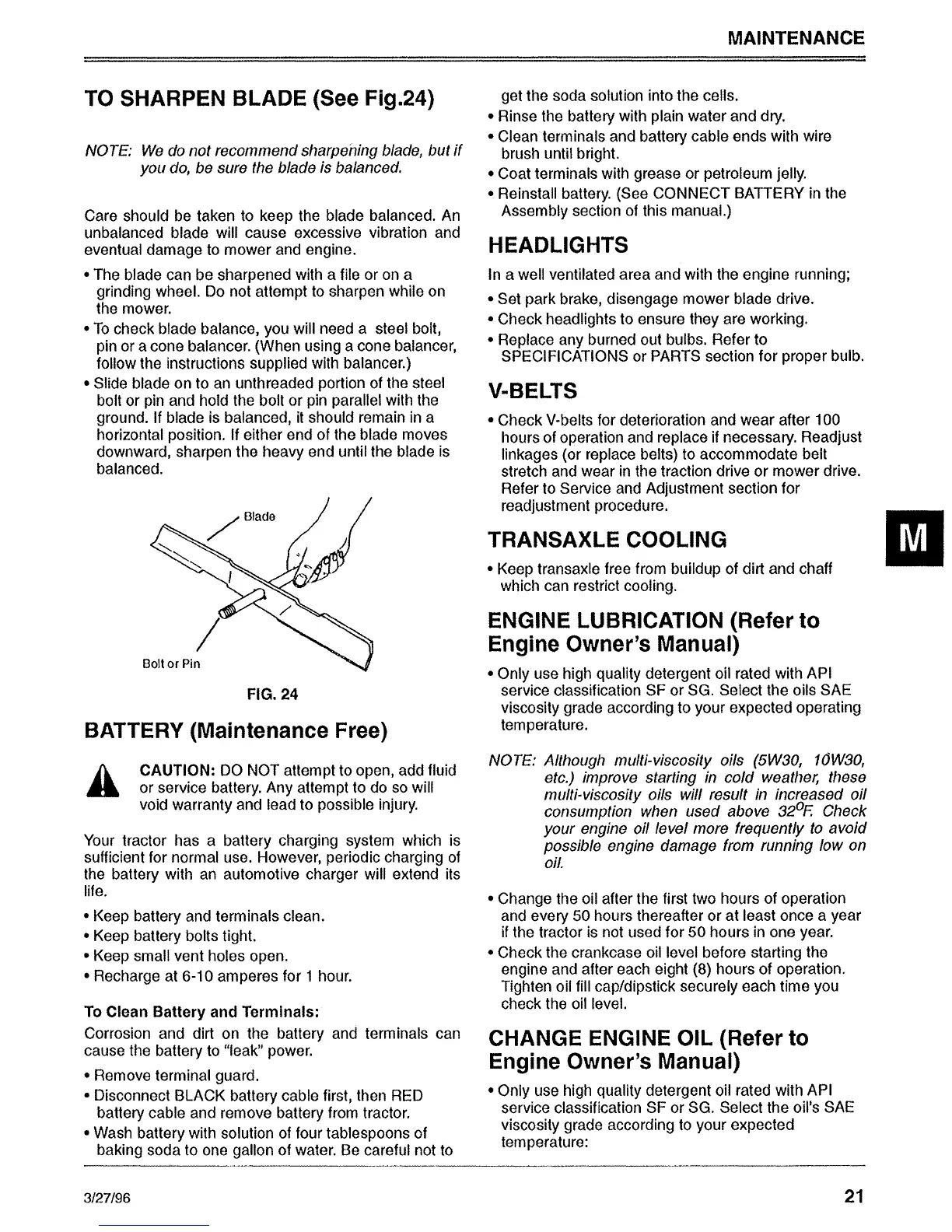Sabre 1646 Hydro - Component Maintenance; Blade Sharpening and Battery Maintenance; Headlights, Belts, Transaxle, and Engine Lubrication