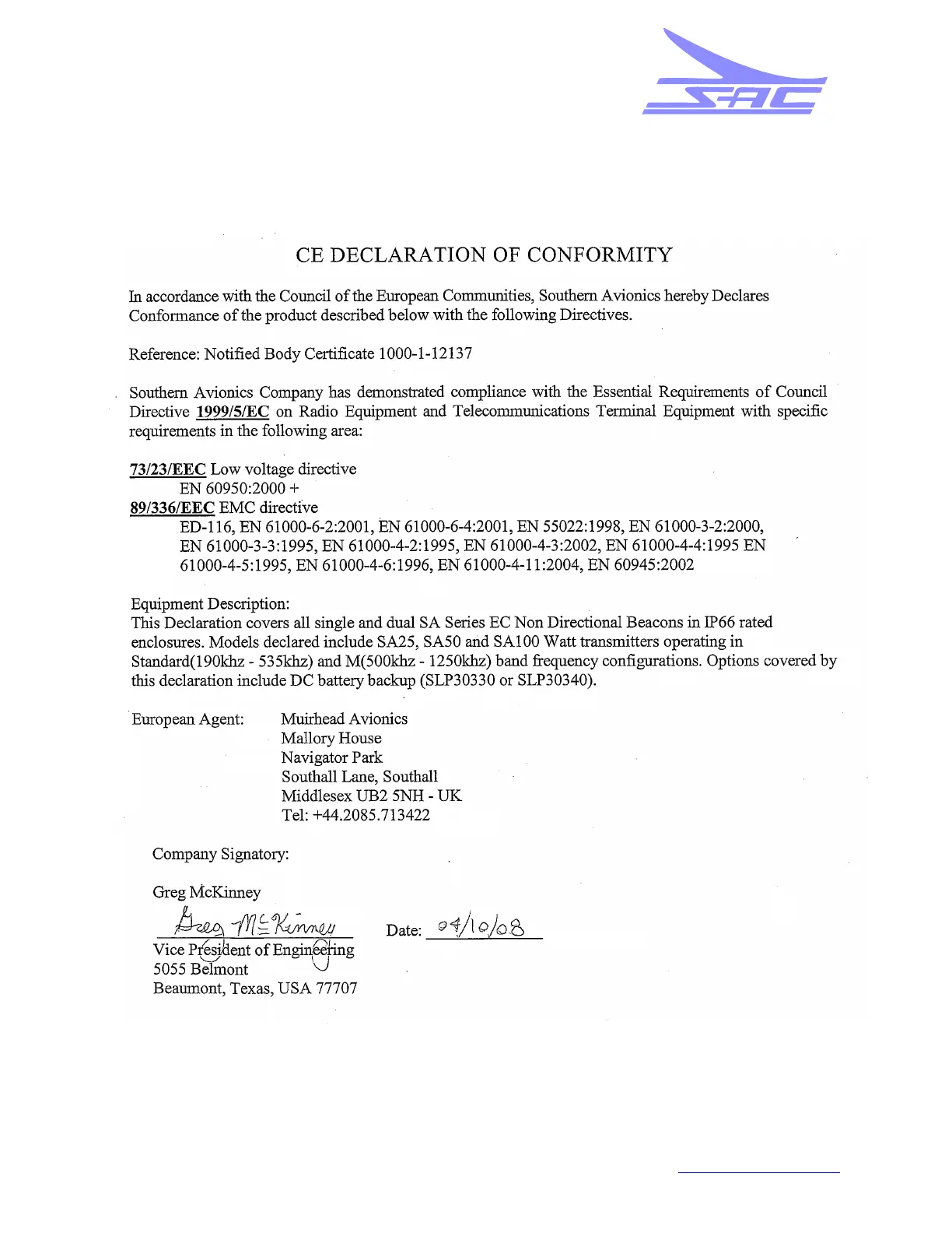 SAC SA100 - CE DECLARATION OF CONFORMITY