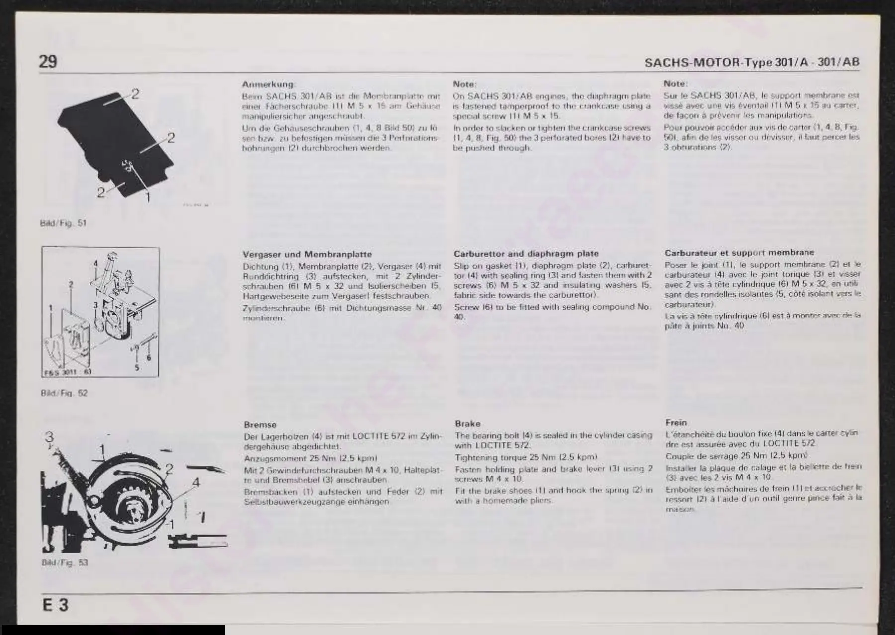 Sachs 301/AB - Carburettor, Diaphragm Plate, and Brake Installation; Carburettor and Diaphragm Plate Installation; Brake Installation and Loctite Sealing