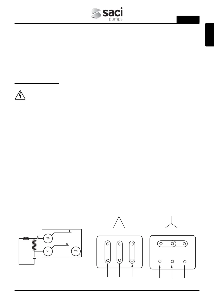Üç fazlı pompalar için kullanıcı motor korumasını yerel yönetmeliklere göre pano içerisine monte etmelidir.