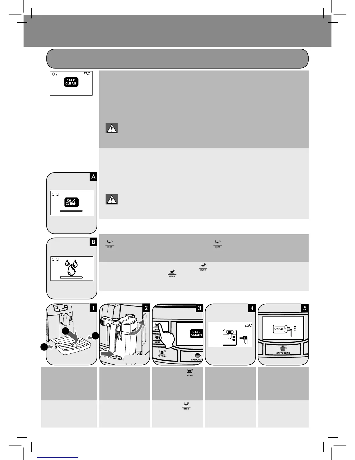 Выполнение цикла очистки от накипи (А) и цикла ополаскивания (В) можно приостановить, нажав кнопку