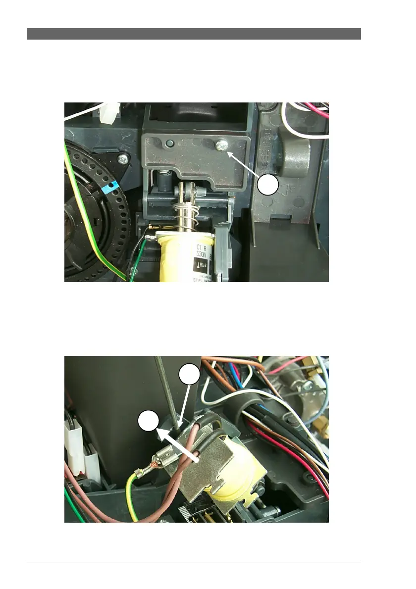 b) Using a screwdriver, release the fastening tab (1) and push dosing magnet out