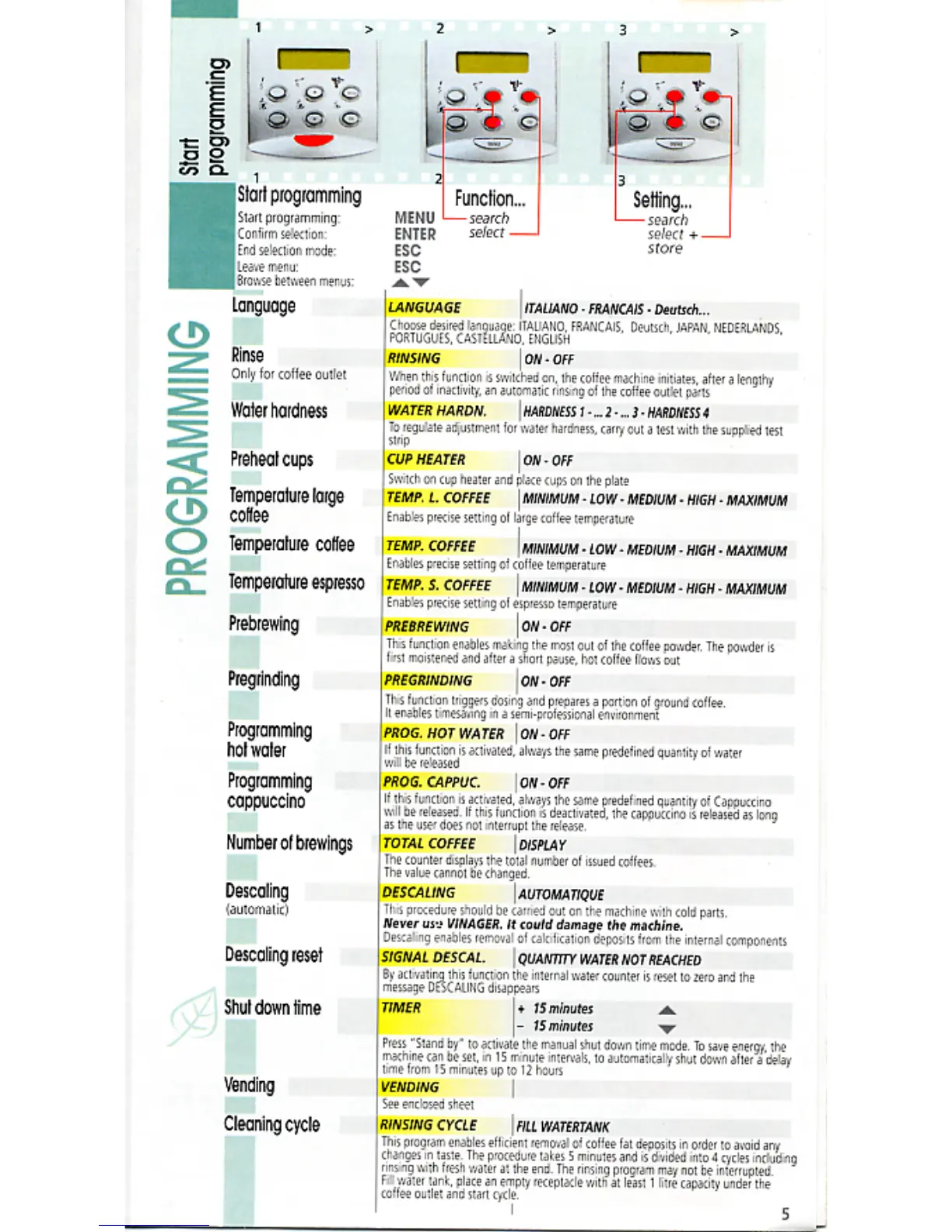 Saeco Royal - Programming and Customization; Setting Up Programs; Configurable Settings