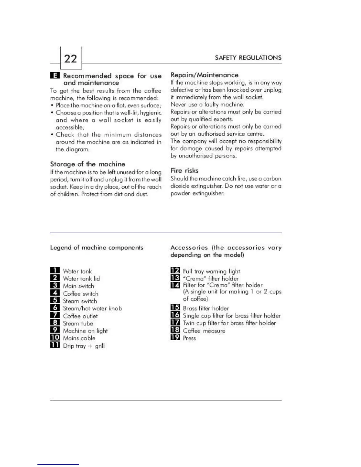 Saeco Sin 010 - Storage of the Machine; Repairs;Maintenance; Legend of Machine Components; Accessories