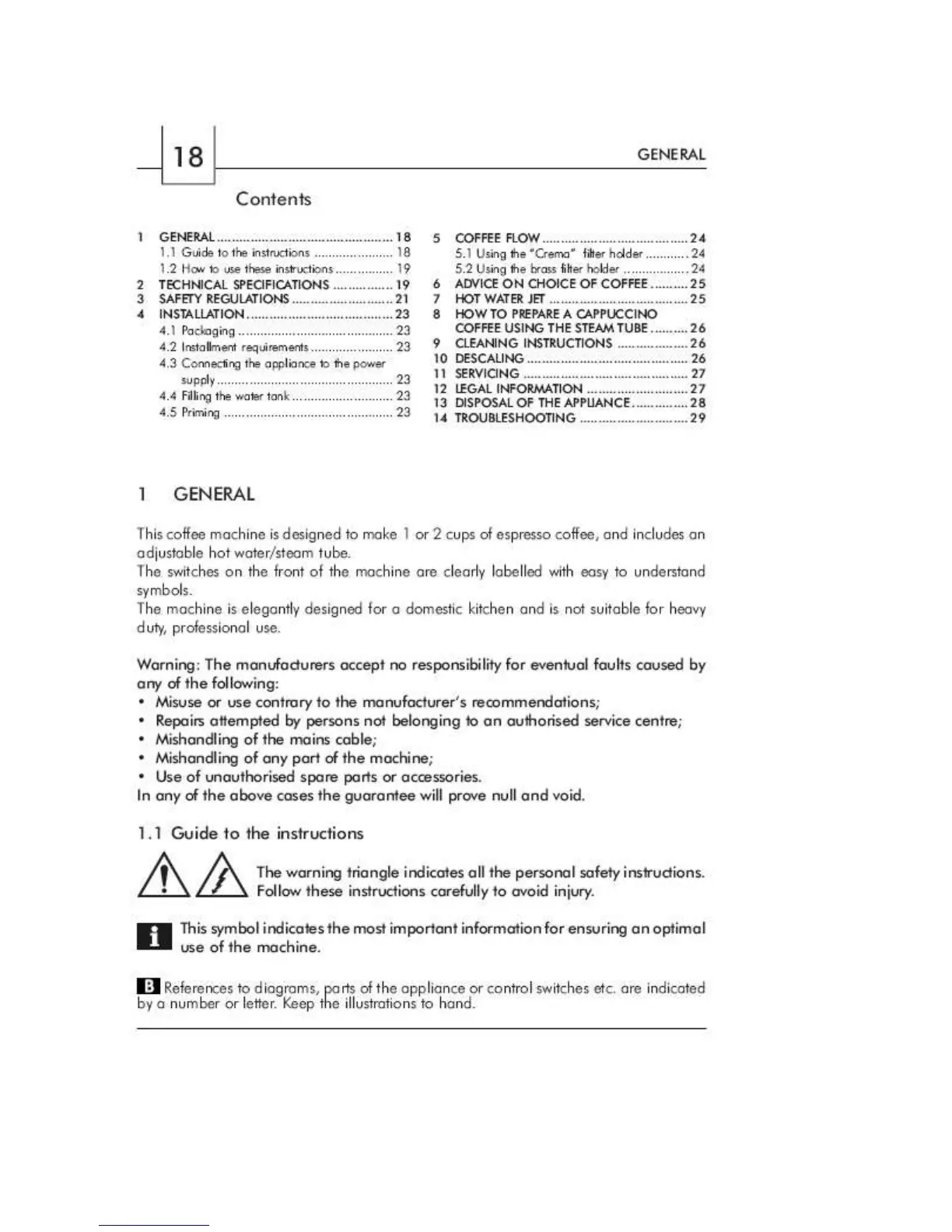 Saeco Sin 010 - Contents; General; Guide to the Instructions