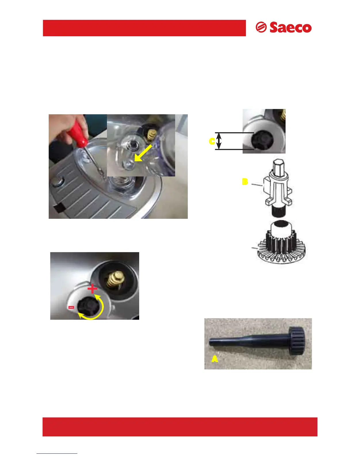 adjustment tool “A”), remove the coffee granule container and turn adjustment insert “B” to
