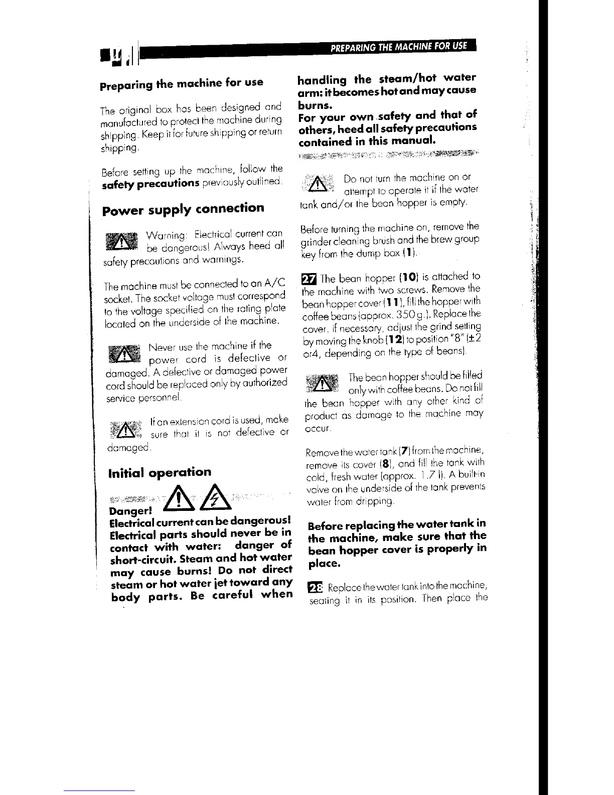 Saeco Vienna Superautomatica - Preparing the Machine for Use; Power Supply Connection; Initial Operation