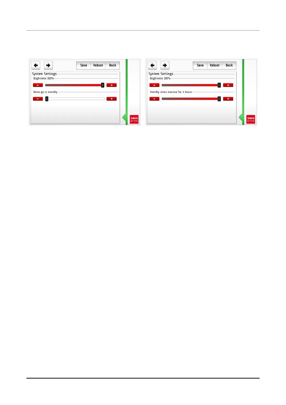 System settings: choose the screen brightness and standby delay (from 0 = never to 4 hours of