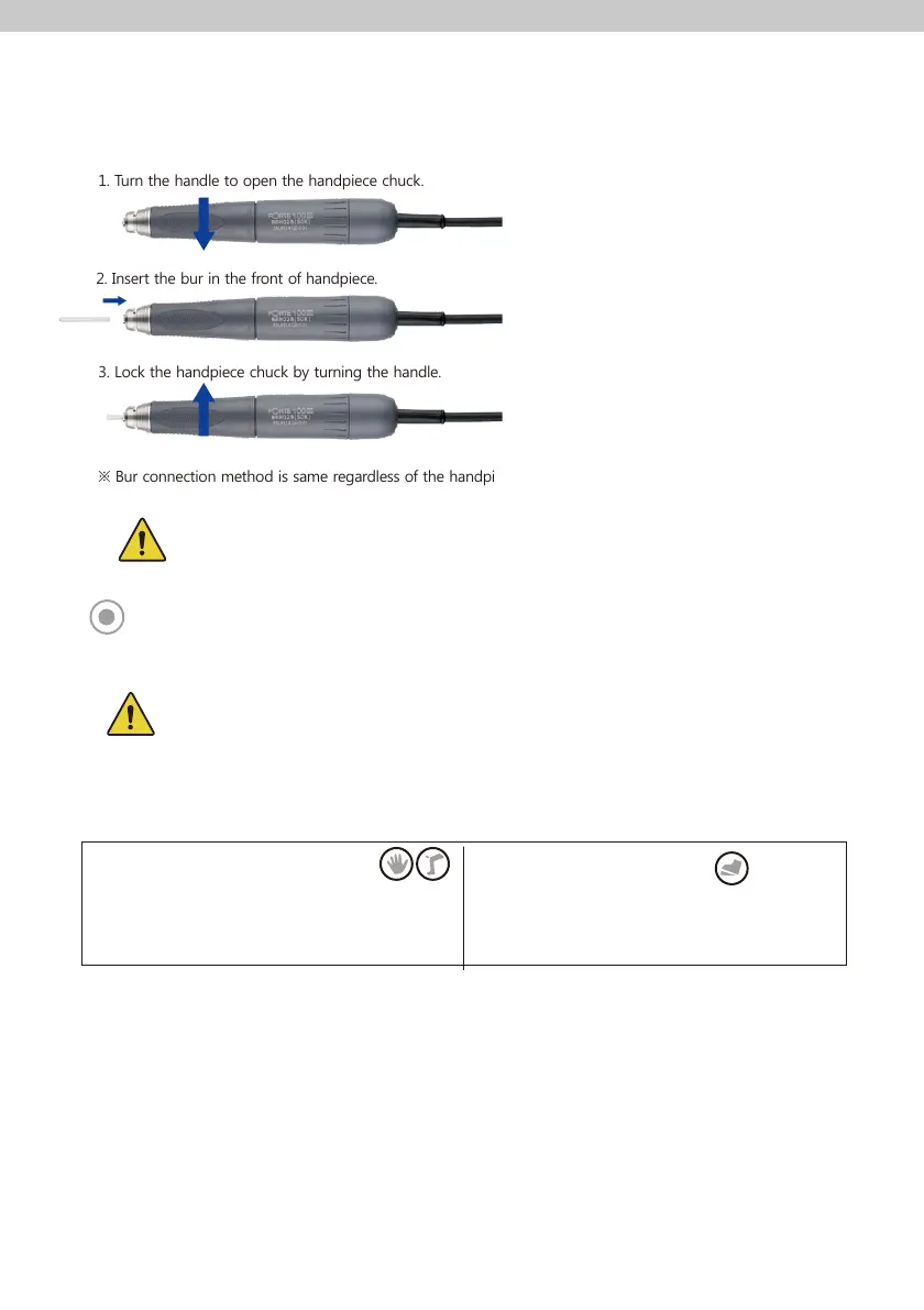 - Be sure to lock the chuck before use. It may cause damage to the handpiece.