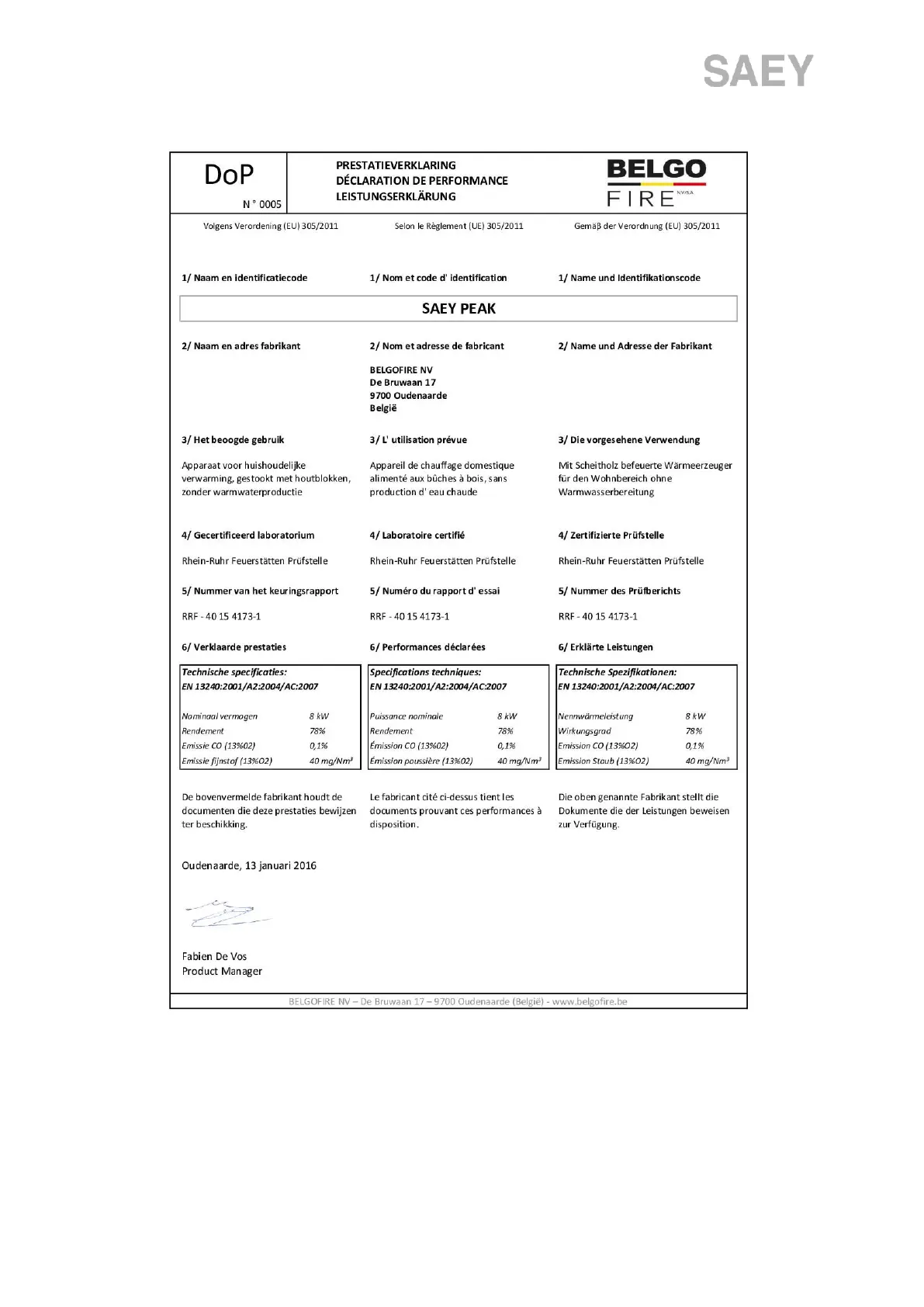 Saey Peak - Declaration of Performance - SAEY PEAK; SAEY PEAK Manufacturer and Intended Use; SAEY PEAK Declared Performance Metrics