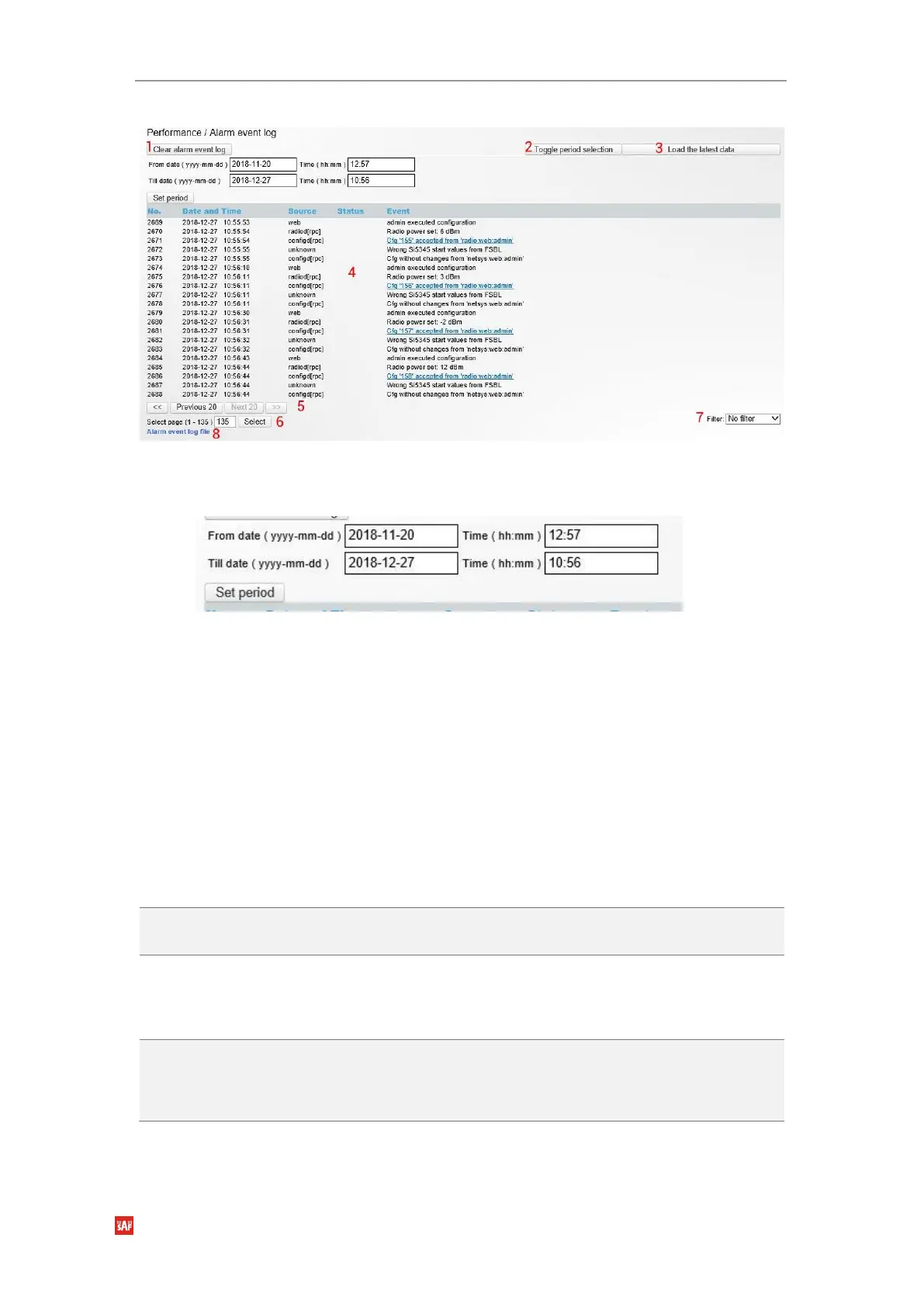 available), while “Next 20” – to next alarm log page showing 20 next alarm log entries (if