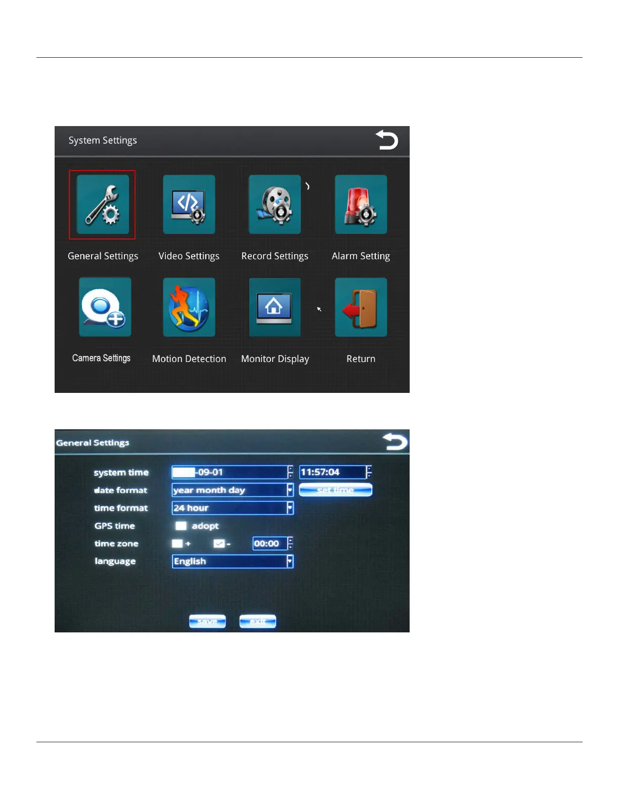 The General Settings menu enables you to set date and time parameters and choose an operating language.