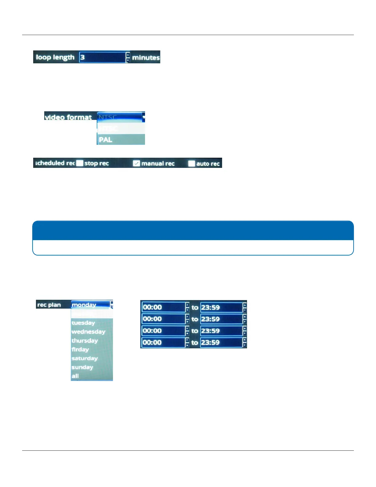 • Stop Rec stops all recording. Stop Rec allows to congure periods of time when the recording should not be