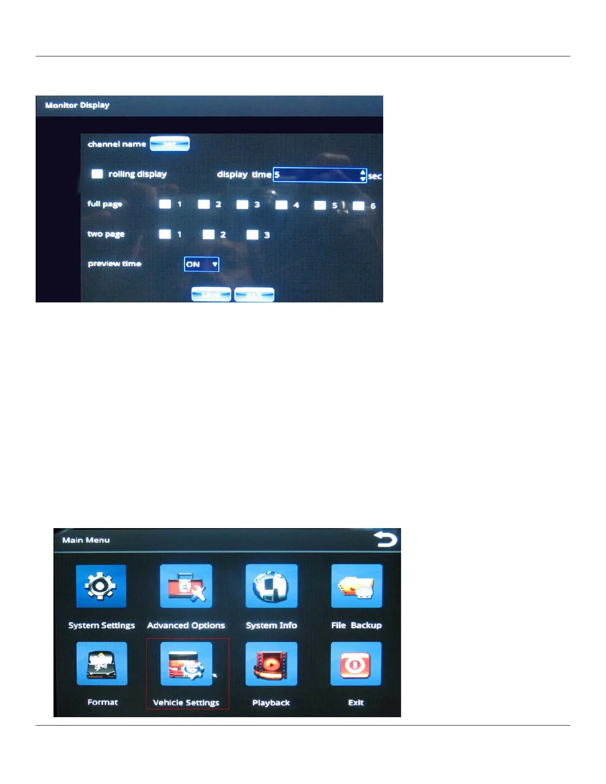 The Monitor Display screen enables you to specify the format for displaying the images from the system’s six camera