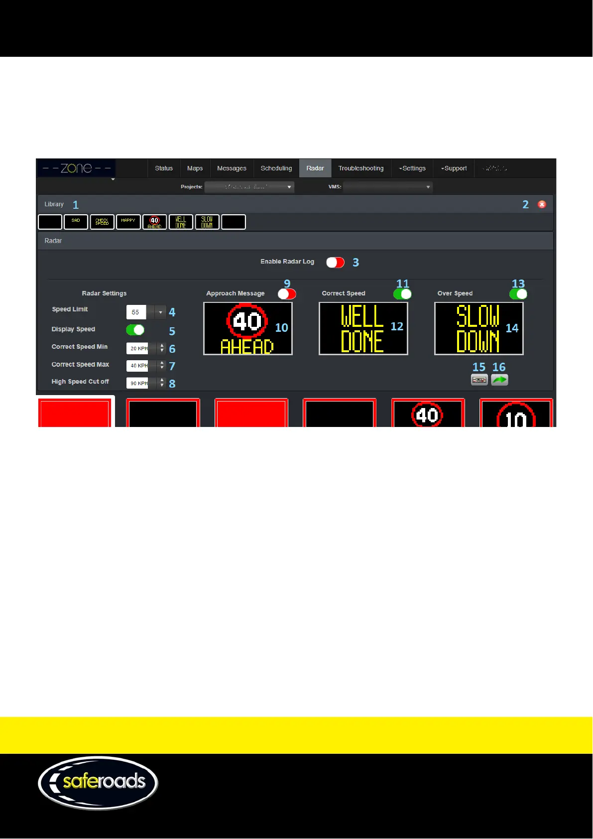 Saferoads Zone 2 VMS - Radar Page; Radar Settings
