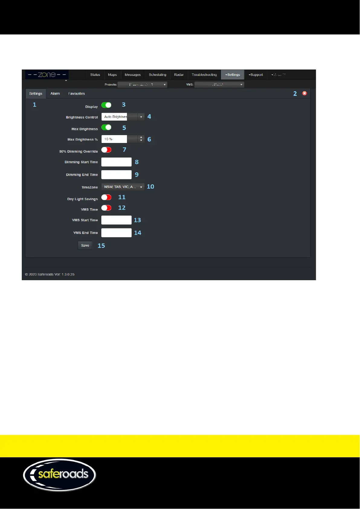 Saferoads Zone 2 VMS - Settings Page; Brightness Control; Max Brightness %