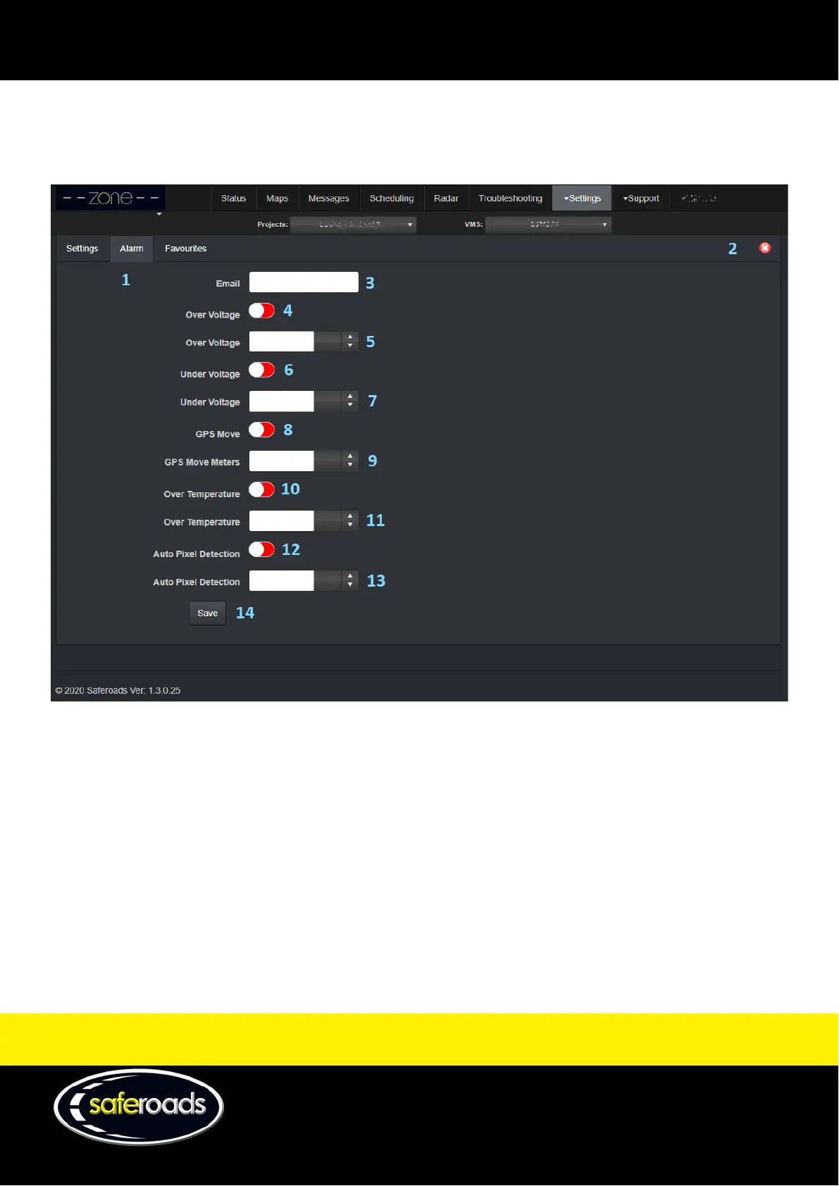 Saferoads Zone 2 VMS - Alarms Page