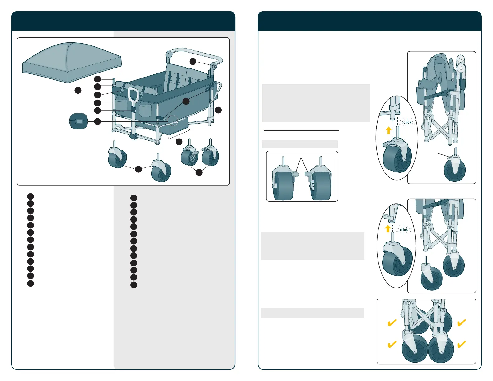 Slide the wheel onto frame until it “clicks.”