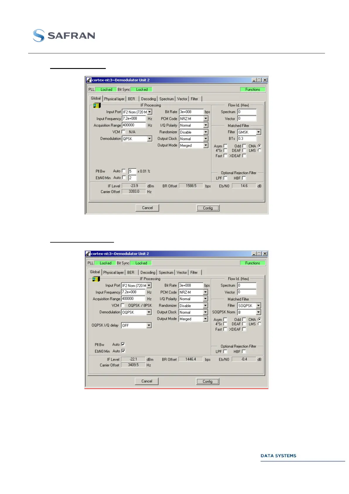 Safran CORTEX Series - Figure 103: Demodulator: Global Window for GMSK Modulation; Figure 104: Demodulator: Global Window for SOQPSK Modulation