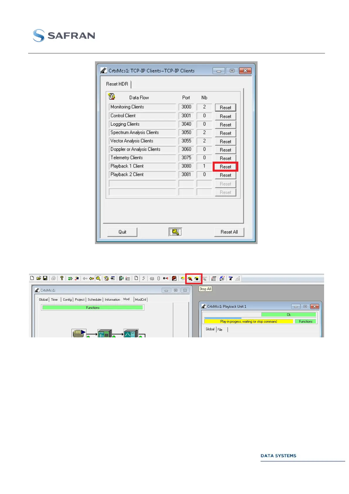 Safran CORTEX Series - Figure 187: Playback LAN: Reset Playback Client Button in TCP-IP Clients Window; Figure 188: Playback LAN: Acquisition and Stop All Buttons in the Toolbar