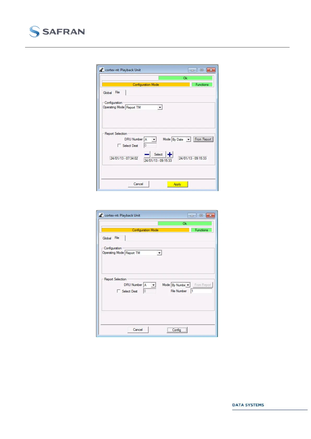 Safran CORTEX Series - File Window; Figure 189: Playback: File Window in Report TM Mode (by Date); Figure 190: Playback: File Window in Report TM Mode (by Number)