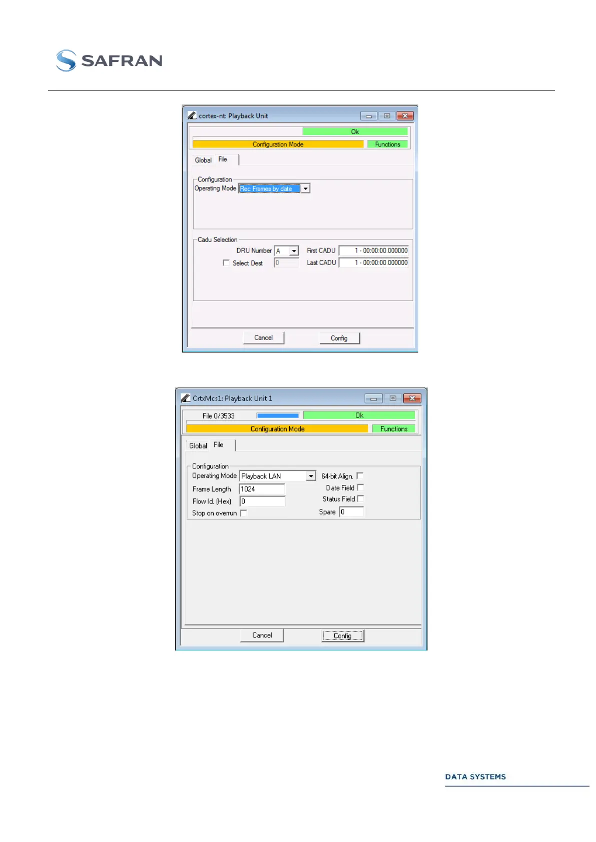 Safran CORTEX Series - Figure 193: Playback: File Window in Recorded Frames Mode; Figure 194: Playback: File Window in Playback LAN Mode