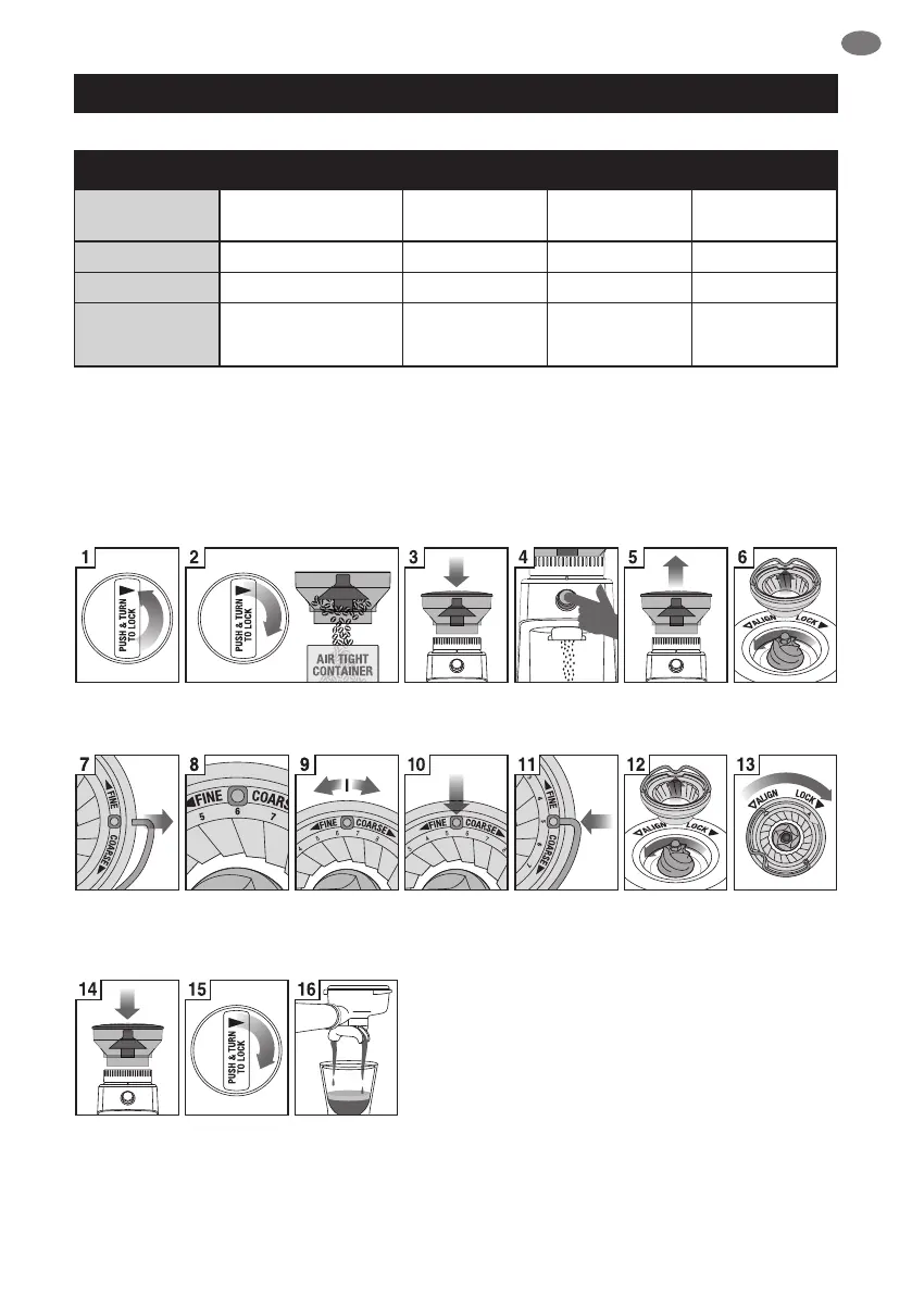 *This coee chart should be used as starting point to adjust your grind time and / or size, as both may vary when using