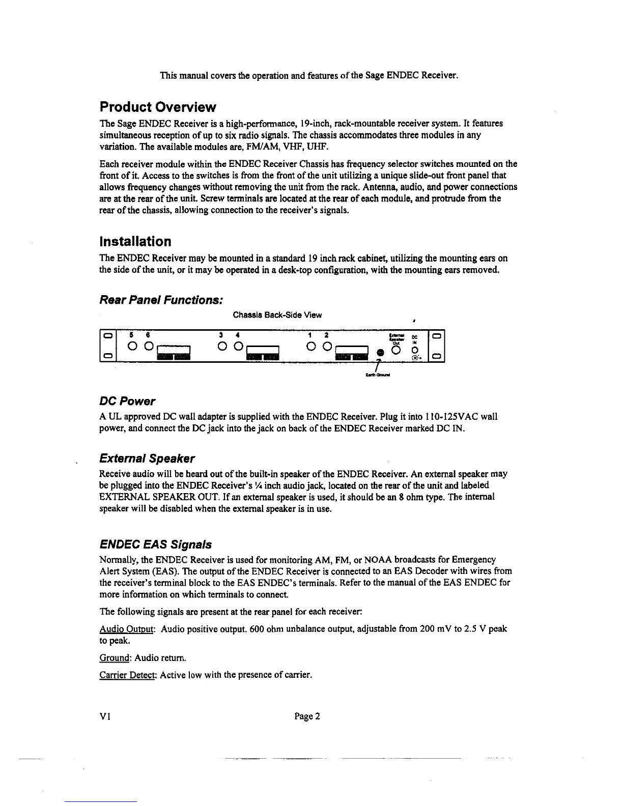 Sage ENDEC - Product Overview and Core Functions; Installation; Rear Panel Functions; Power and Audio Connections