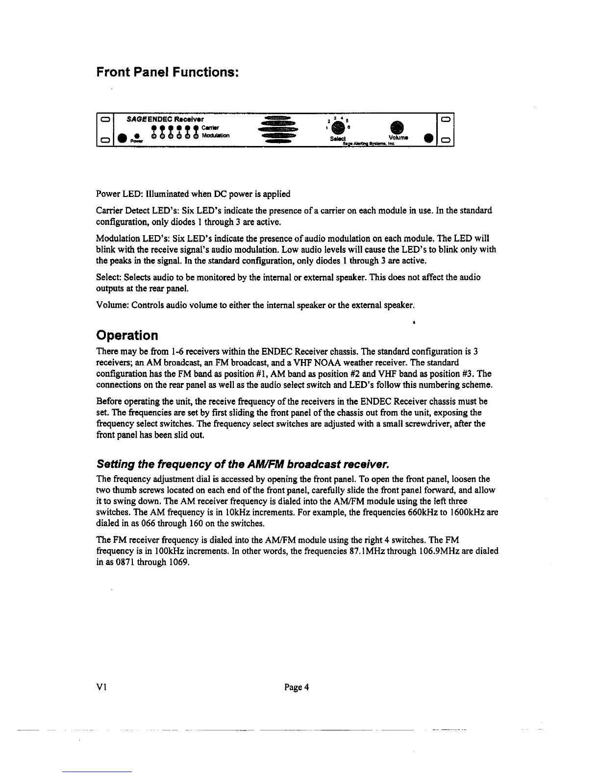 Sage ENDEC - Front Panel and Operation; Front Panel Controls and Indicators; Operation and Frequency Setting