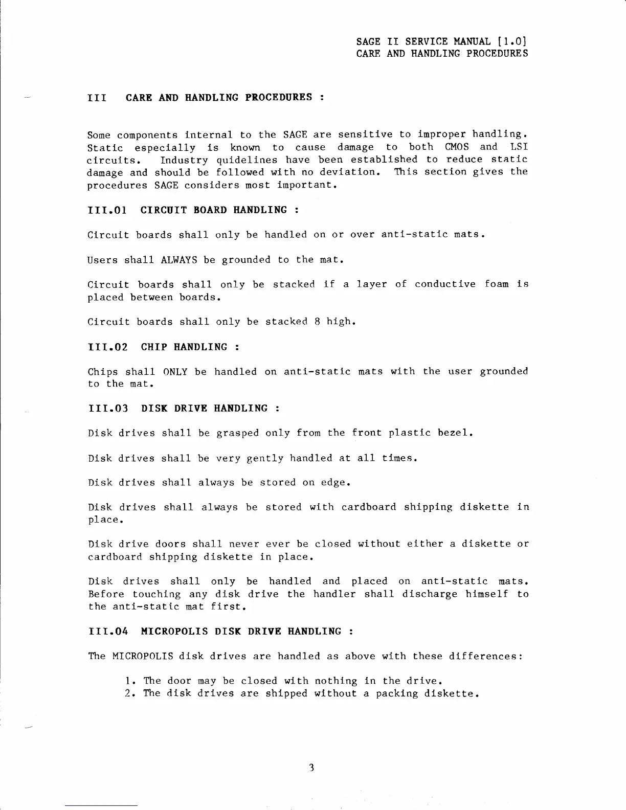 Sage II - Care and Handling Procedures; Circuit Board Handling; Chip Handling; Disk Drive Handling