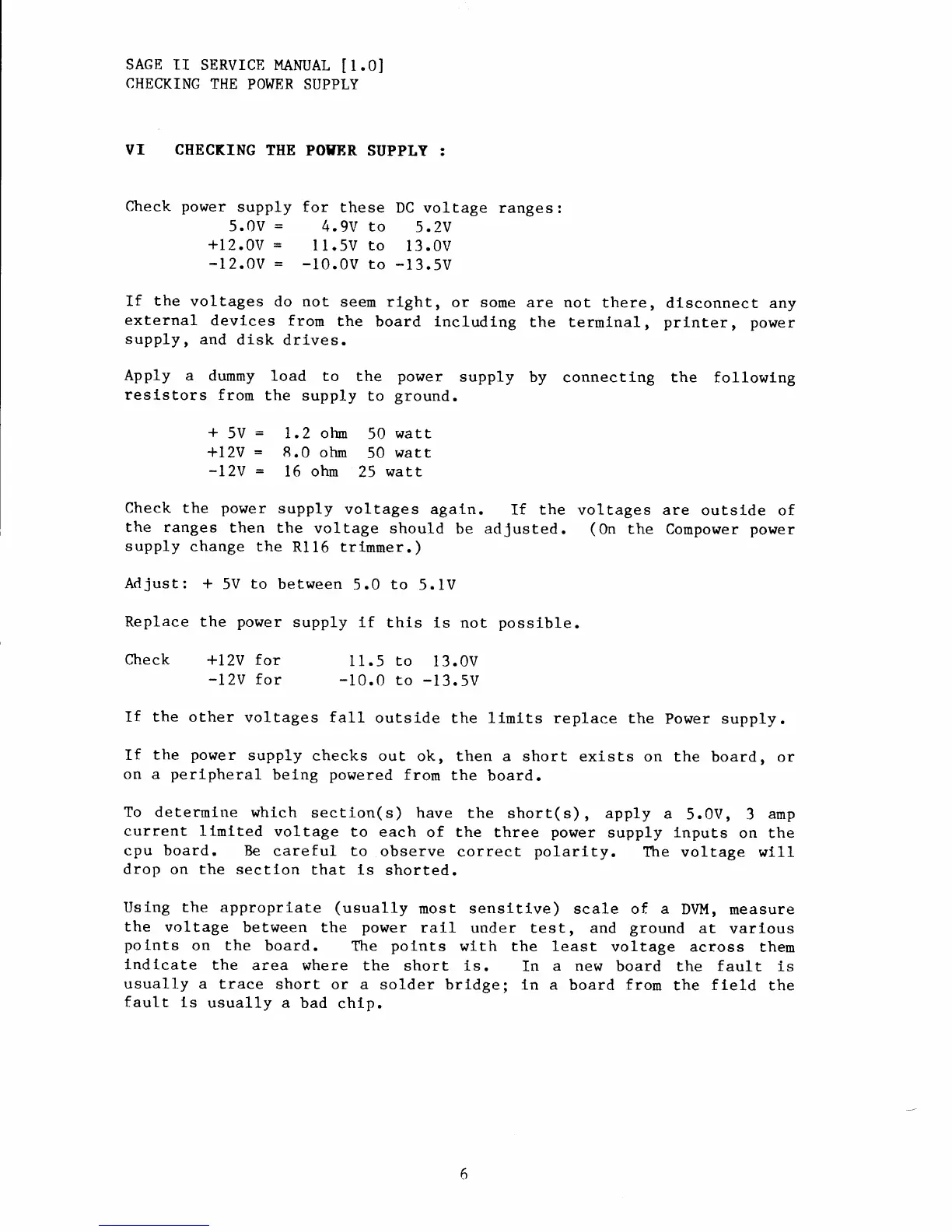 Sage II - Checking the Power Supply; DC Voltage Ranges; Dummy Load Application; Power Supply Adjustment and Replacement
