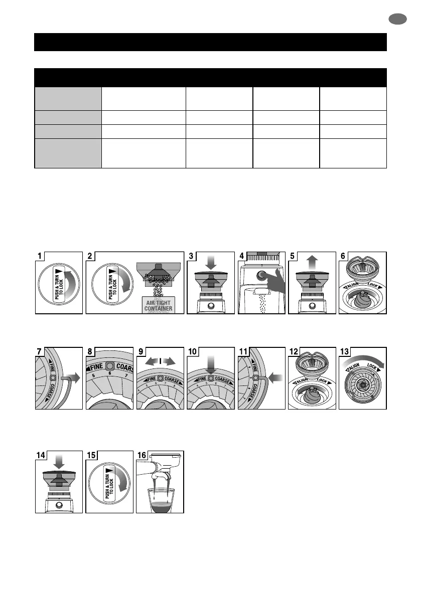 *This co ee chart should be used as starting point to adjust your grind time and / or size, as both may vary when using