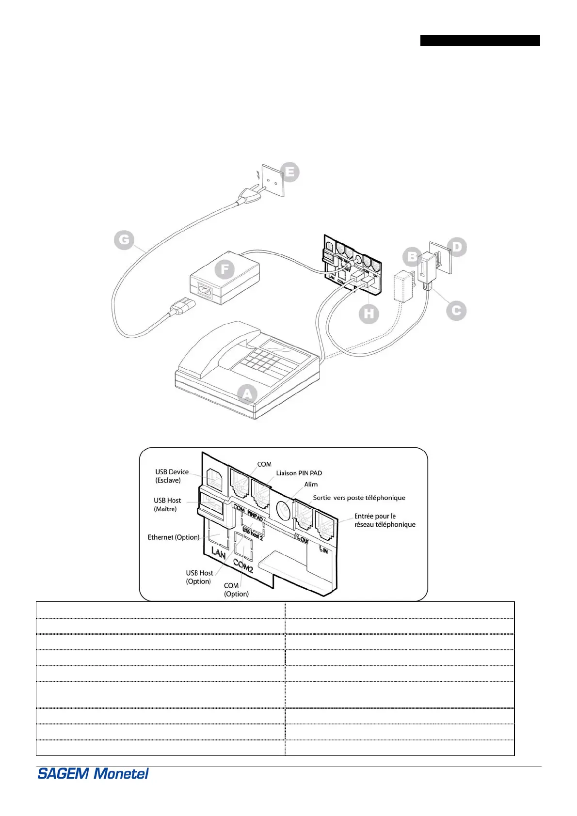 C = raccordement au réseau téléphonique D = prise d'arrivée du réseau téléphonique