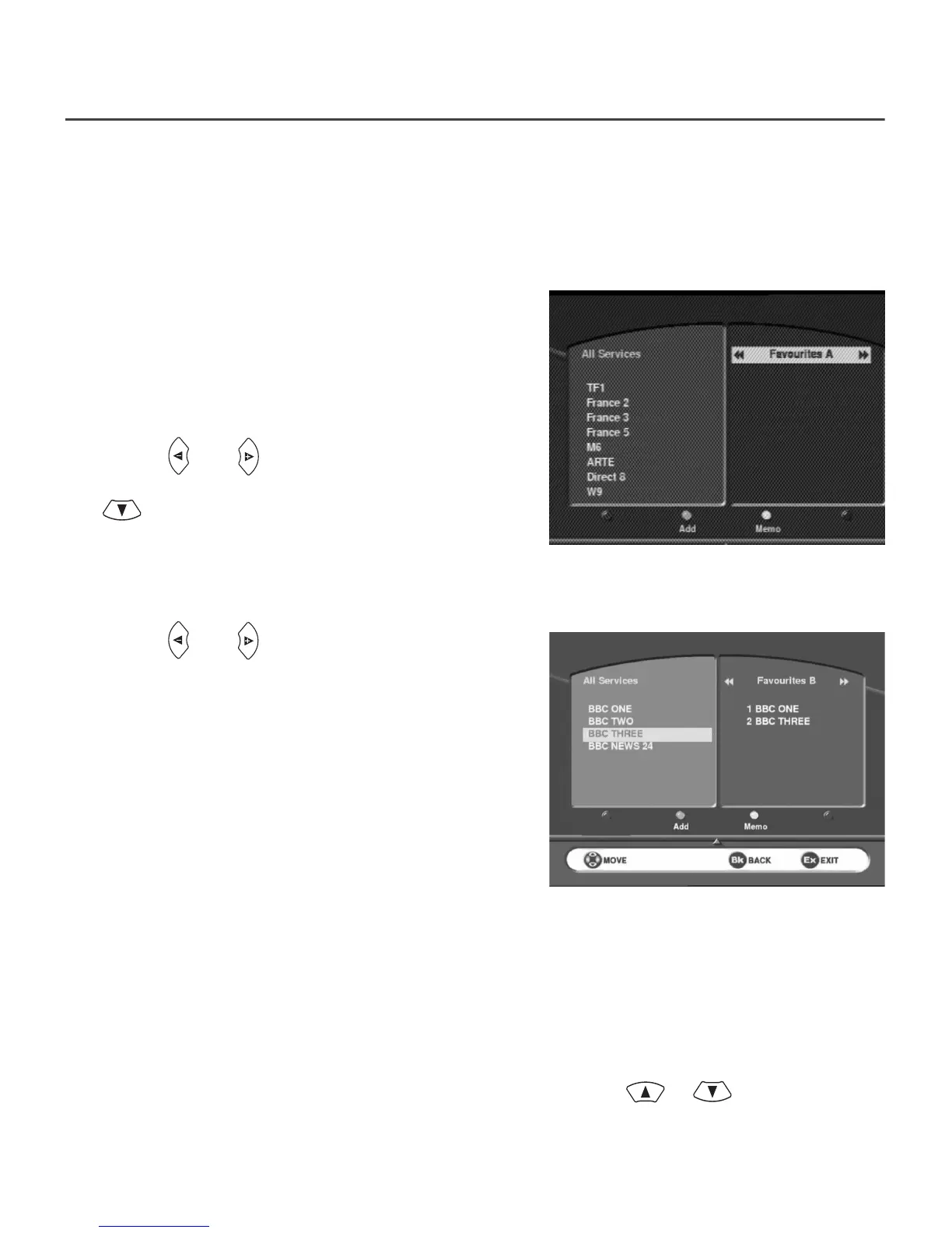 • To move a channel from one place to another in a favourite list, delete it and then insert it from