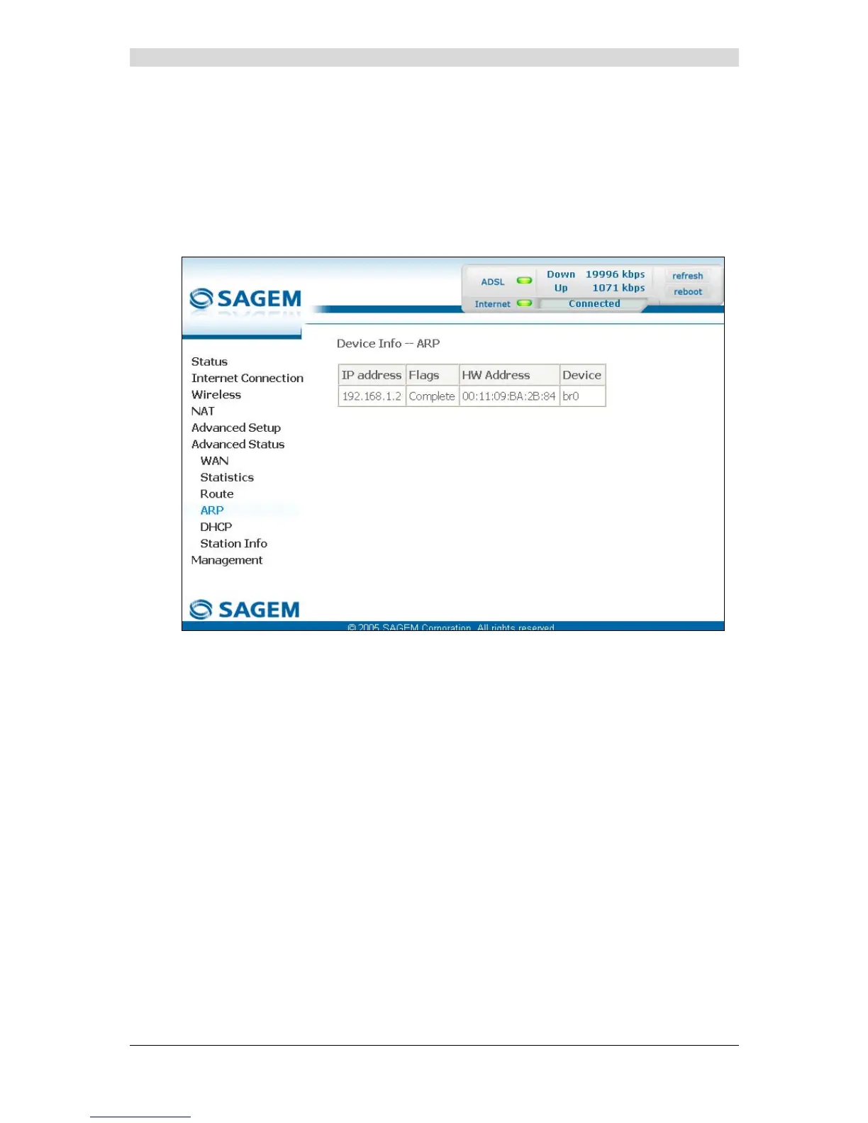 • Select the ARP menu in the Advanced Status section to display the following screen:
