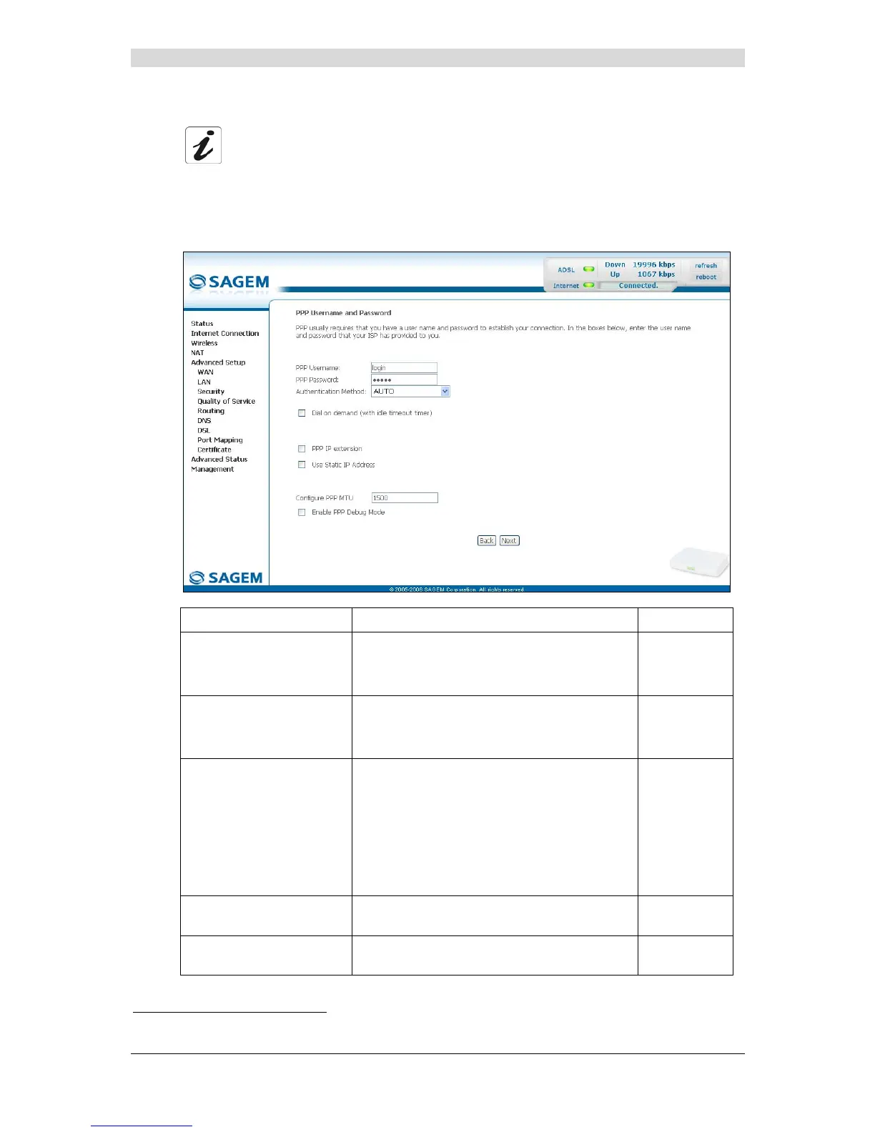 Depending on the type of network protocol (PPPoA, PPPoE, MER, IPoA or Bridging)