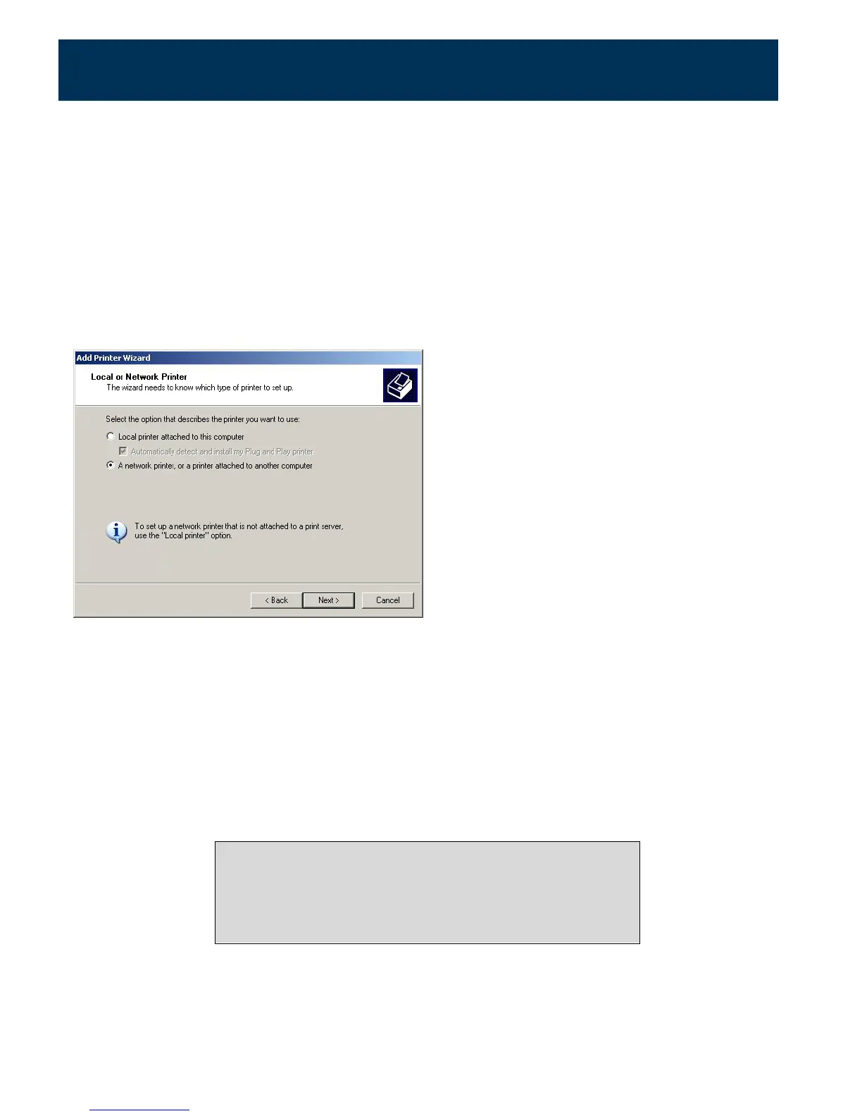 Choose "A network printer, or a printer attached to another computer."