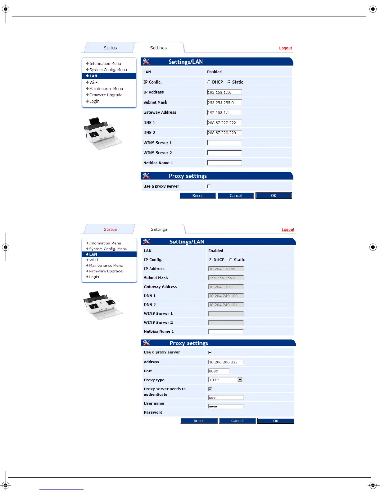 the proxy settings. The screen below gives an example of how to configure LAN proxy settings.