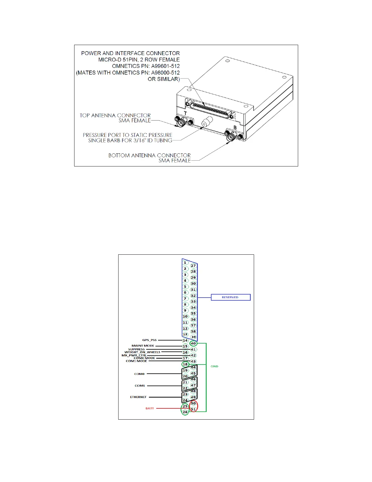 The MXS Main Connector is a 51-pin Micro-D type female connector that provides aircraft power and the